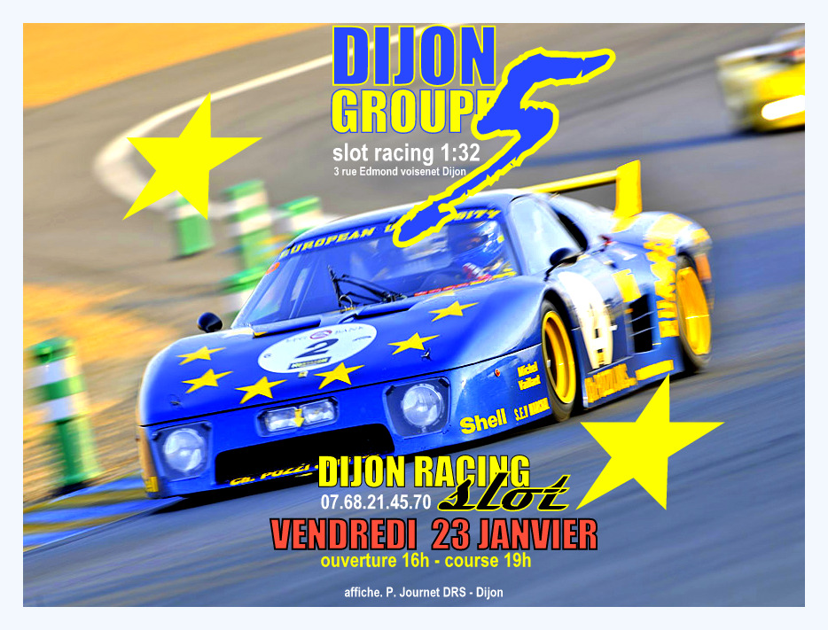 Première course de la saison 18 au Dijon Racing Slot. Sept pilotes au départ avec les performantes GR5 Sideways.