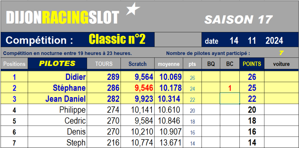 Sept pilotes ce soir au club et souhaitons la bienvenue à Stéphane (Steph pour ne pas le confondre avec le titulaire) qui n’a pas démérité pour sa première course.