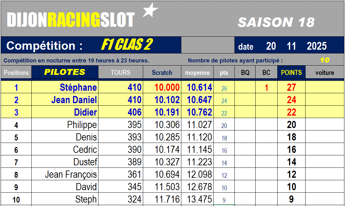 Deuxième course de la saison pour les F1 Classic Policar. 10 pilotes au rendez vous. C’est Stéphane qui détrône pour la première fois le président pour quelques centièmes de secondes.