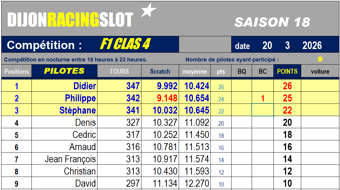Quatrième course de la saison pour les F1 Classic Policar. 9 pilotes au rendez vous. Les habitués sur le podium et ça commence à descendre sous les 10 secondes.
