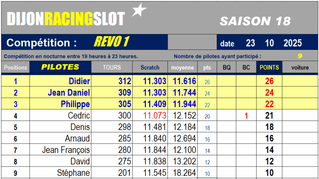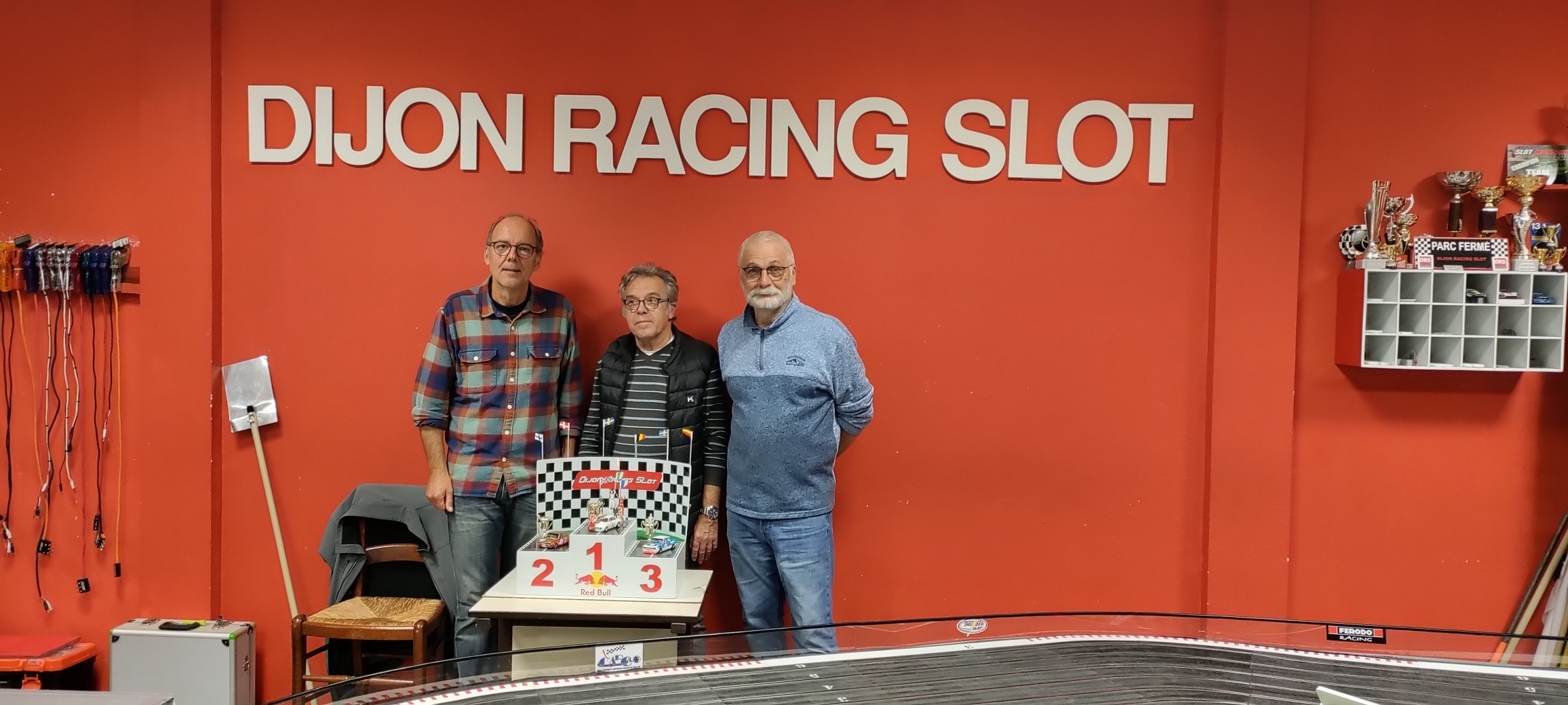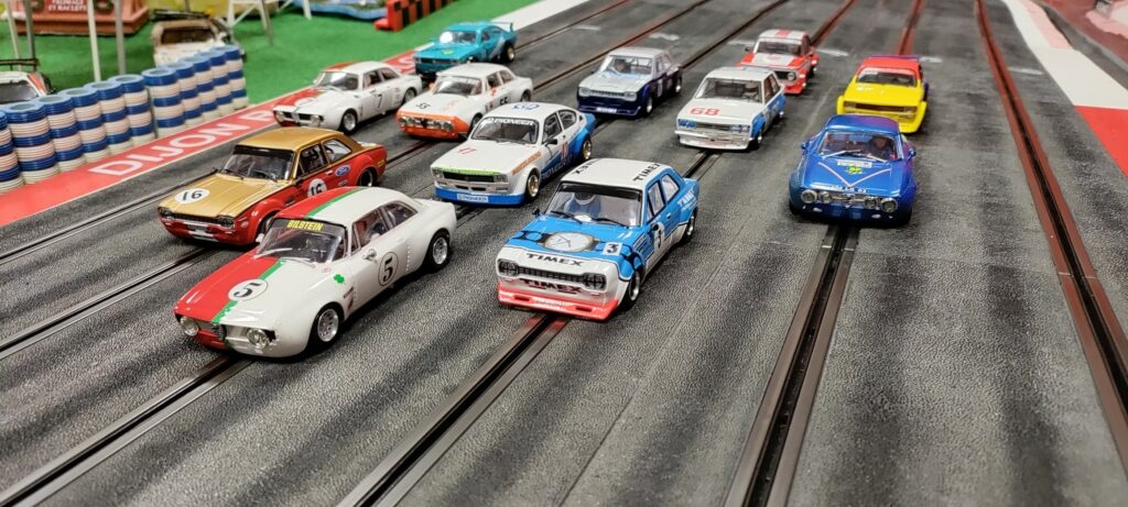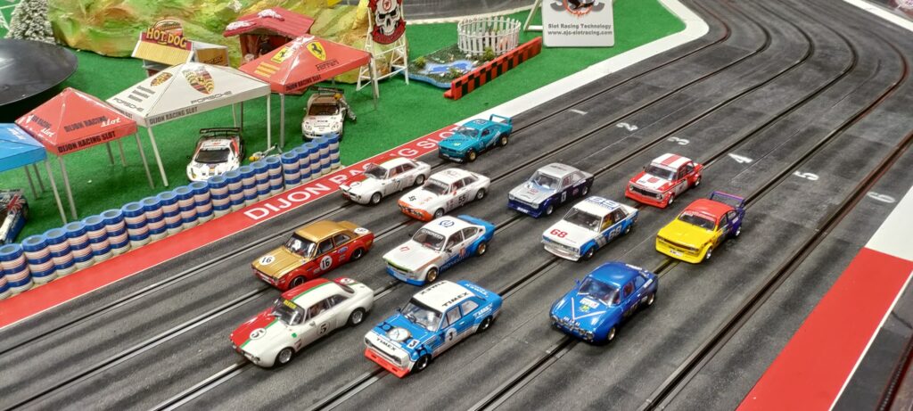 Première course de la saison pour cette nouvelle catégorie voitures de tourisme Groupe 2 RevoSlot. Châssis et transmission métalliques, axes montés sur roulements à billes, de la belle mécanique, mais les performances se font attendre. Pas un temps sous les 11 secondes…