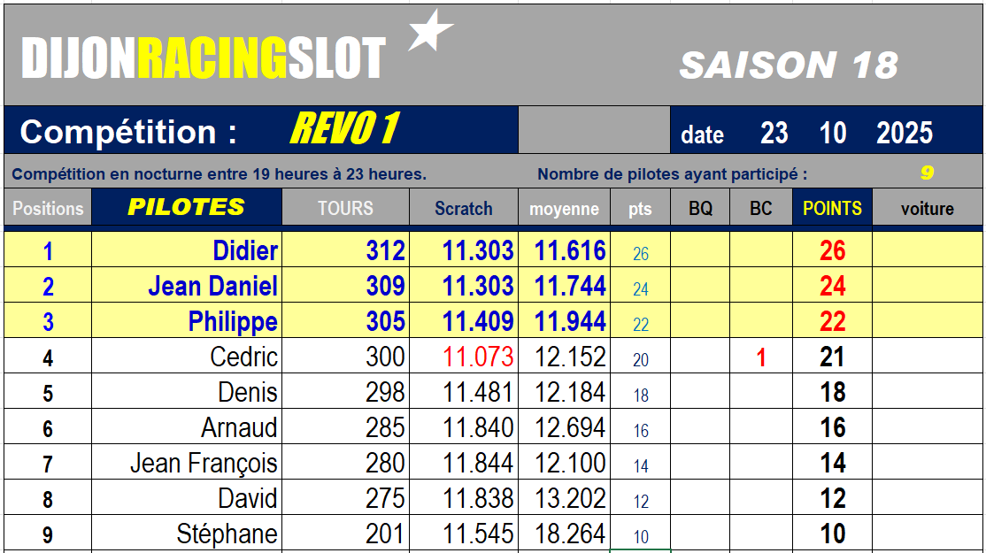 Première course de la saison pour cette nouvelle catégorie voitures de tourisme Groupe 2 RevoSlot. Châssis et transmission métalliques, axes montés sur roulements à billes, de la belle mécanique, mais les performances se font attendre. Pas un temps sous les 11 secondes…