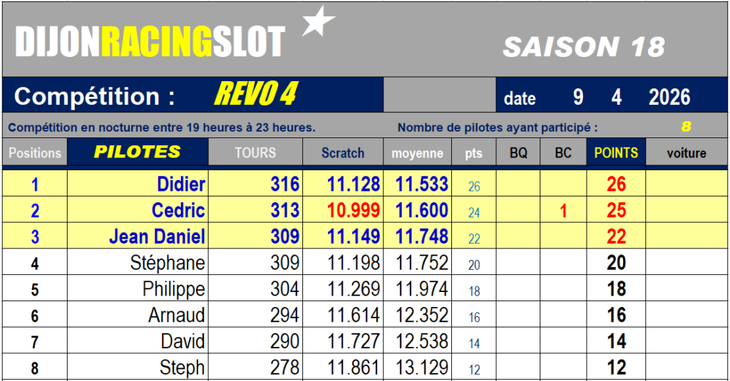 Quatrième course de la saison pour cette nouvelle catégorie voitures de tourisme Groupe 2 RevoSlot. Un seul temps juste sous les 11 secondes par Cédric.